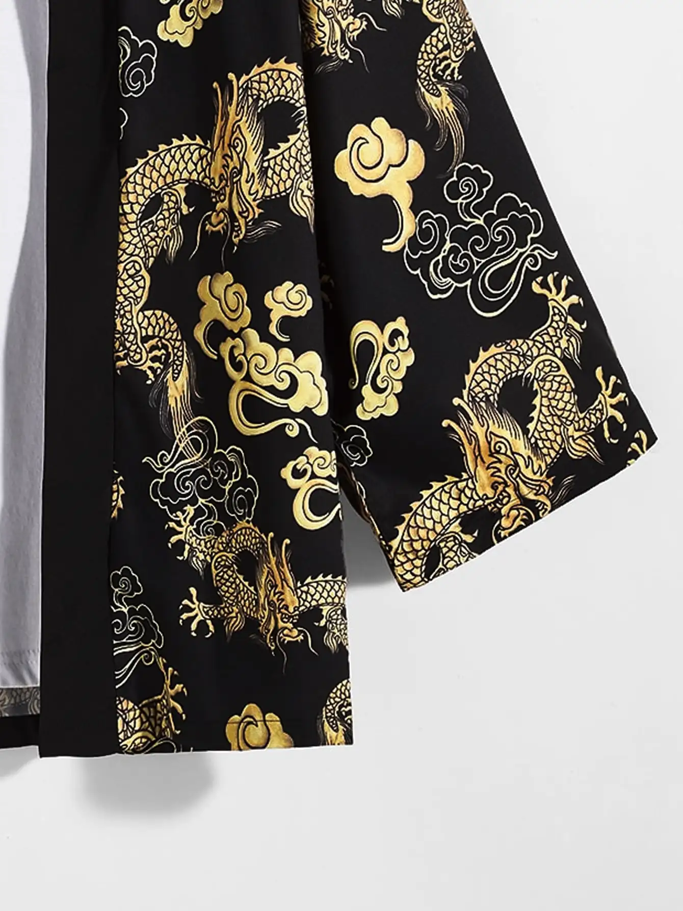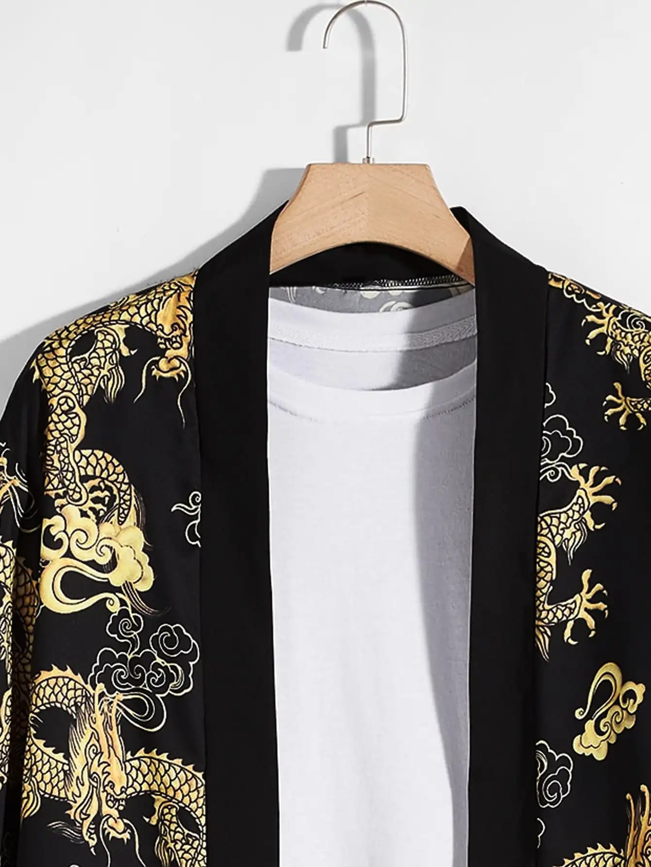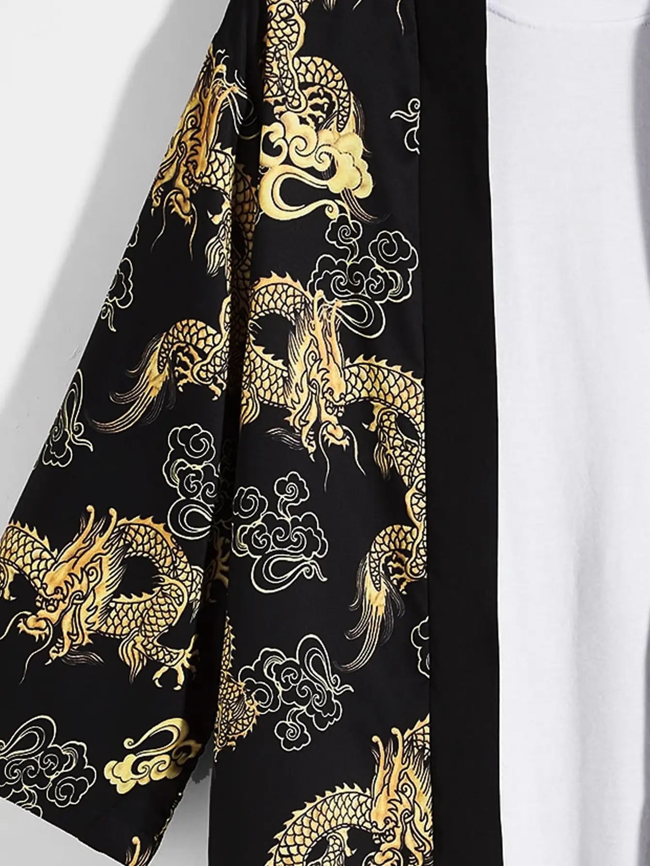 Para aficionados al cosplay o fiestas de disfraces, este kimono japonés estampado dragón dorado para hombre es una pieza imprescindible. Te permite transformarte en un personaje icónico de la cultura asiática, manteniendo la comodidad. Añade una peluca y una espada de madera para un disfraz completo e impresionante.